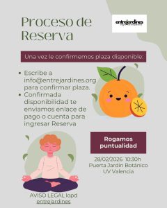 RECIBIDA LA RESERVA le remitiremos a su mail la CONFIRMACIÓN DE SU PLAZA y las indicaciones de horario y preparación para esta bonita actividad. Un abrazo . entrejardines.